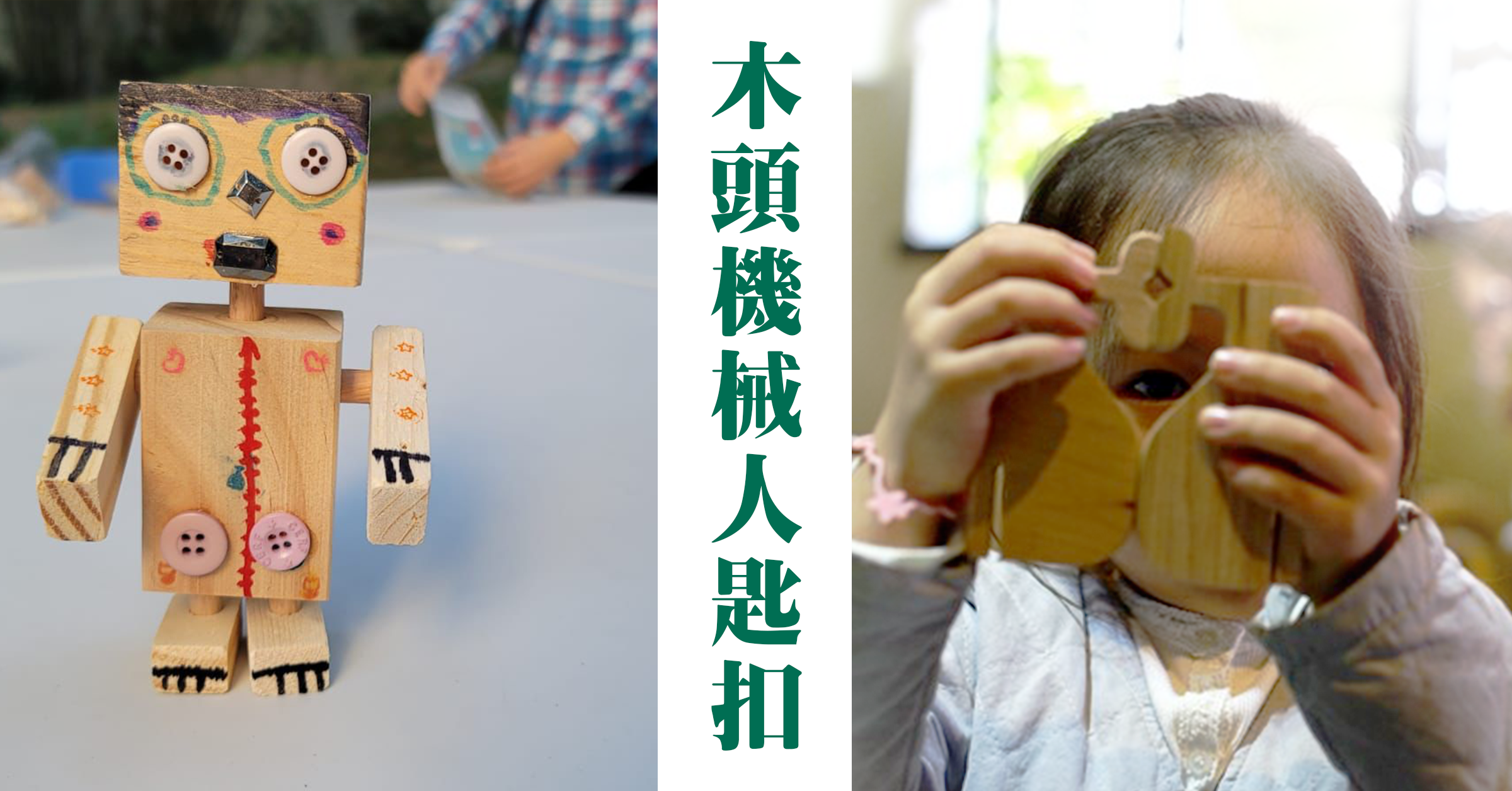 木工不止係大人既玩意,小朋友都可以一嚐木藝既快樂。幾塊木頭加上螺絲,就可以造成簡單既機械人造型匙扣/鏈嘴。是次木作坊會有導師教小朋友如何正確使用小工具及打磨木件。