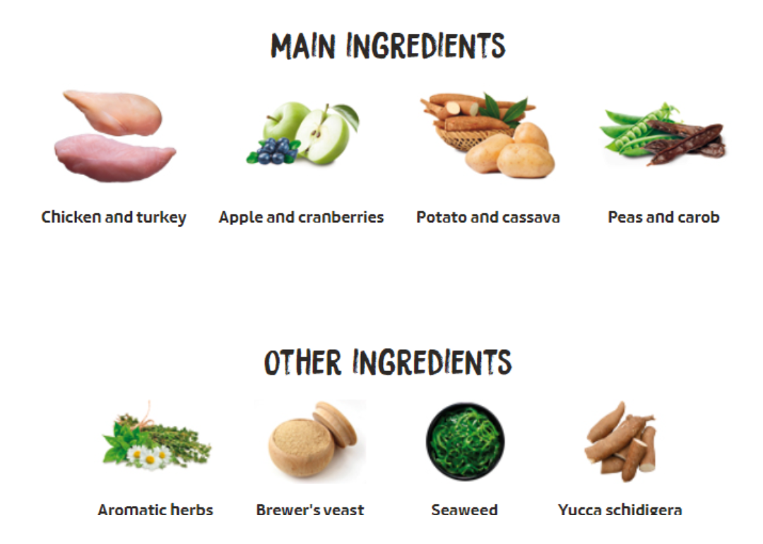 新鮮雞肉和火雞肉*(擠出前最少50%)、脫水肉(雞肉火雞豬肉共21%)、整粒豌豆*、家禽脂肪(天然抗氧化劑保存)、木薯根*、脫水土豆*、脫水魚(鳀魚、馬鮫魚和鯖魚)、脫水雞蛋*、啤酒酵母*、水解雞肉蛋白、新鮮蘋果*(1%)、甜菜漿、魚油(用天然抗氧化劑保存)、岩鹽*、脫水苜蓿*、果寡糖和甘露寡糖、脫水海藻*、氨基葡萄糖、軟骨素、絲蘭萃取物、蔓越莓*、百里香*、洋甘菊花*、茴香*、松果菊*、綠茶*。*符合FEDIAF定義之天然成份