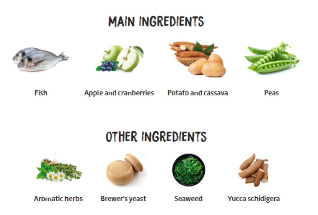 魚肉37%(新鮮魚*擠出前最少20%,水解鮭魚10%,脫水魚7%),脫水肉類(雞肉火雞豬肉共21%),整粒豌豆*,木薯根*,家禽脂肪(用天然抗氧化劑保存)、脫水馬鈴薯*、啤酒酵母*、水解雞肉蛋白、甜菜漿、新鮮蘋果*(1%)、魚油(用天然抗氧化劑保存)、岩鹽*、脫水苜蓿*、果寡糖和甘露寡糖、脫水海藻 *、氨基葡萄糖、軟骨素、絲蘭萃取物、蔓越莓*、百里香*、甘菊花*、茴香*、紫錐花*、綠茶*。*符合FEDIAF定義之天然成份