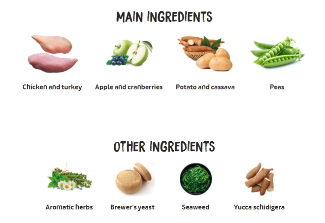 新鮮雞肉和火雞肉*(擠出前最少50%)、脫水肉(雞肉火雞豬肉共20%)、木薯根*、整粒豌豆*、水解鮭魚蛋白、脫水馬鈴薯*、脫水魚(鳳尾魚、竹莢魚和鯖魚)、啤酒酵母*、甜菜漿、家禽脂肪(用天然抗氧化劑保存)、水解雞肉蛋白、脫水雞蛋*、新鮮蘋果*(1%)、魚油(用天然抗氧化劑保存)、岩鹽*、脫水苜蓿*、果寡糖和甘露寡糖、脫水海藻*、氨基葡萄糖、軟骨素、絲蘭萃取物、蔓越莓*、百里香*、甘菊花*、茴香*、紫錐花*、綠茶*。*符合FEDIAF定義之天然成份