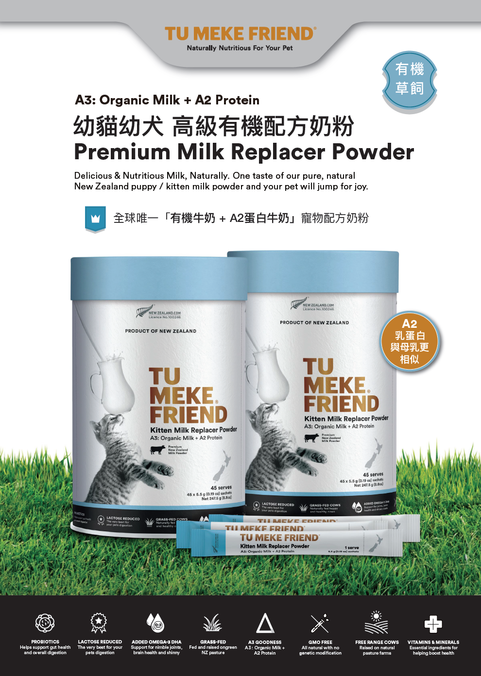 Tu Meke Friend 幼犬奶粉 是一種配製的營養補充劑,適用於母親無法分泌足夠的牛奶或作為孤兒小貓的唯一飼料。